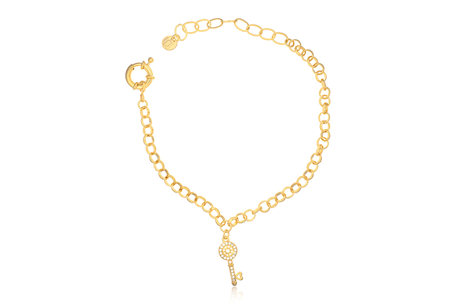 PULSEIRA INFANTIL BANHADA EM OURO, ELO DUPLO 1,80mm E CARTIER 3,50x1,90mm, 15cm COMPRIMENTO, CORAÇÃO, ANJO E CHAVE
