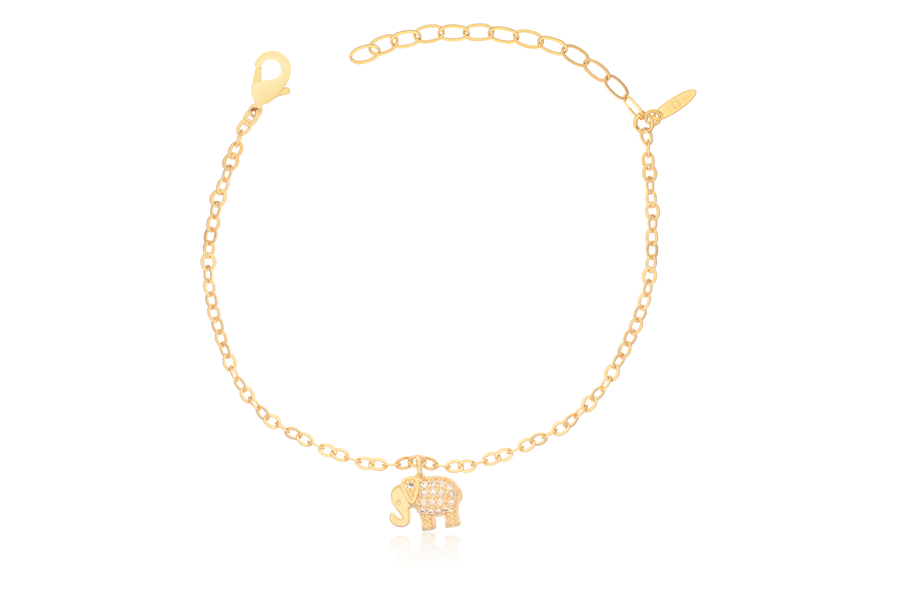 PULSEIRA BANHADA EM OURO, ELO OVAL 2,30mm LARGURA, 16cm COMPRIMENTO, EXTENSOR 5cm E ELEFANTE 11mm COMPRIMENTO