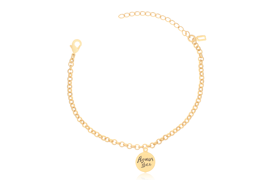 PULSEIRA INFANTIL BANHADA EM OURO, ELO DUPLO 1,80mm E CARTIER 3,50x1,90mm, 15cm COMPRIMENTO, CORAÇÃO, ANJO E CHAVE