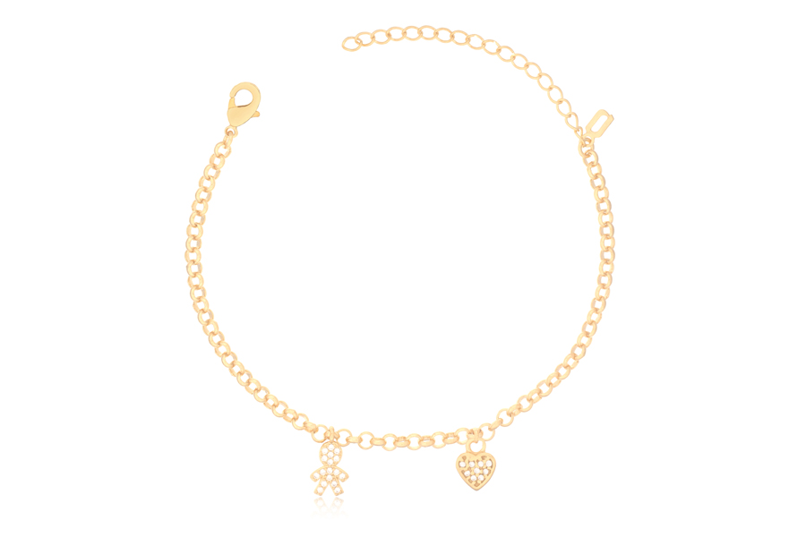 PULSEIRA BANHADA EM OURO, ELO PORTUGUÊS 3mm, ELO CORAÇÃO 4,20mm LARGURA, PINGENTE CORAÇÃO 11mm LARGURA COM MENINO